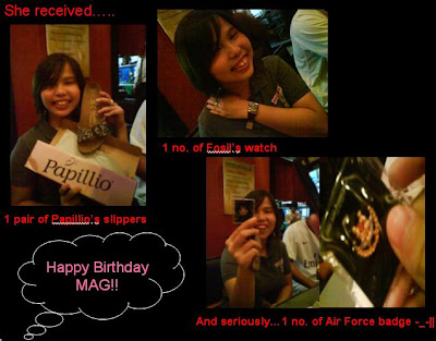 On Friday his birthday itself, we decided to eat something special so we searched the web and came across 'BOTAK JONES'!! We've heard it, not yet tried it so we did!! There're several outlets, we went to the closest which is @ Clementi~ Although its located in a coffee shop style kopitiam but it has got its own banner, special counter for orders and really many staff working there!![]() ![]() Ordered: The famous Double Patty Burger, Turkey Sauages & Casear Salad Costing only like $24, no GST, damn good!! Not stingy with its portions at all, 5stars!! DAMN full after that! Met up with Mag, Swee Ann, Elvin, Chuan & Jeffrey after that.. Went to have our steak near bugis, we're too full that we shared a set! -_- *No pic as pic from Chuan normally takes a decade to reach us so nvm* After dinner, went Marina Square, 'Changing Appetite' to have our drinks. All of us were damn full by then, so we got junming a slice of cake, lol..A cake then would really kill us! Anyway, here's their gift to Junming`ge!! He really love it alot!! He's always hoping for a crumpler, and he gets it.. ![]() On Saturday evening, met up with Belinda, Hong Zhang & Benson. We dine @ Fish Manhanttan, YUMMY!! Seafood platter!! e Best!! They gave him a Fresh Imp shirt, NICE!! ^^ After that, Benson left & the 2 couples went for this movie: (Not forgeting we played the football game @ e Addidas shop like SIAO!) ![]() Super Lame! Suitable for people who're damn bored! Maggie Q kissing a Fatso in this movie, omg... To think of it, its not easy to be a star also, lol..